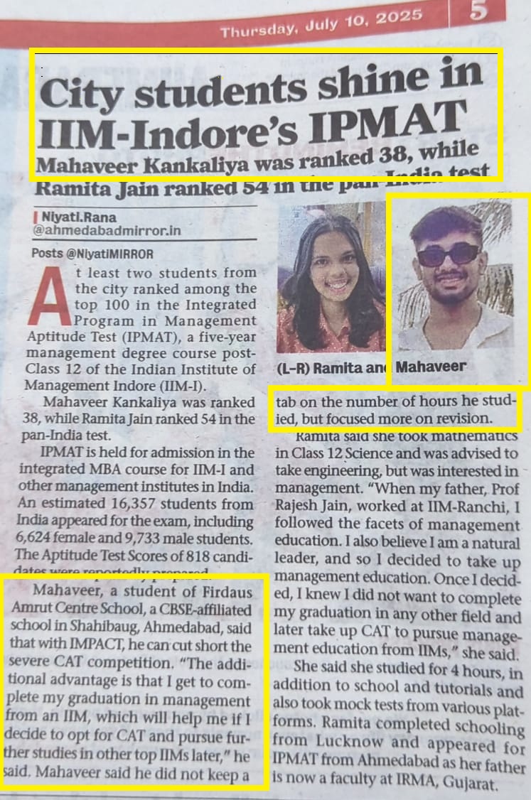 Master Mahaveer K. Topper of Std 12, Session 2024 - 25 has been selected for 5 years Management Degree Corse in IIM -Indore.